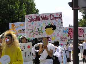 校長先生のお話を聞く生徒たち、ディズニー風の衣装や中央にはお馬さんに扮装した生徒さんも見られます
