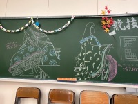 黒板に、紫式部と清少納言がアート風に描かれ、「競技かるた」のルールについても丁寧に示されていて、来場者も「競技かるた」に挑戦していました。
