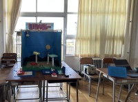 SSHロボット部では、ダンボールで作られたミニクレーンゲームの展示や、未経験者もOKのプログラミング体験などがありました。ミニクレーンゲームは実際に遊ぶこともできました!