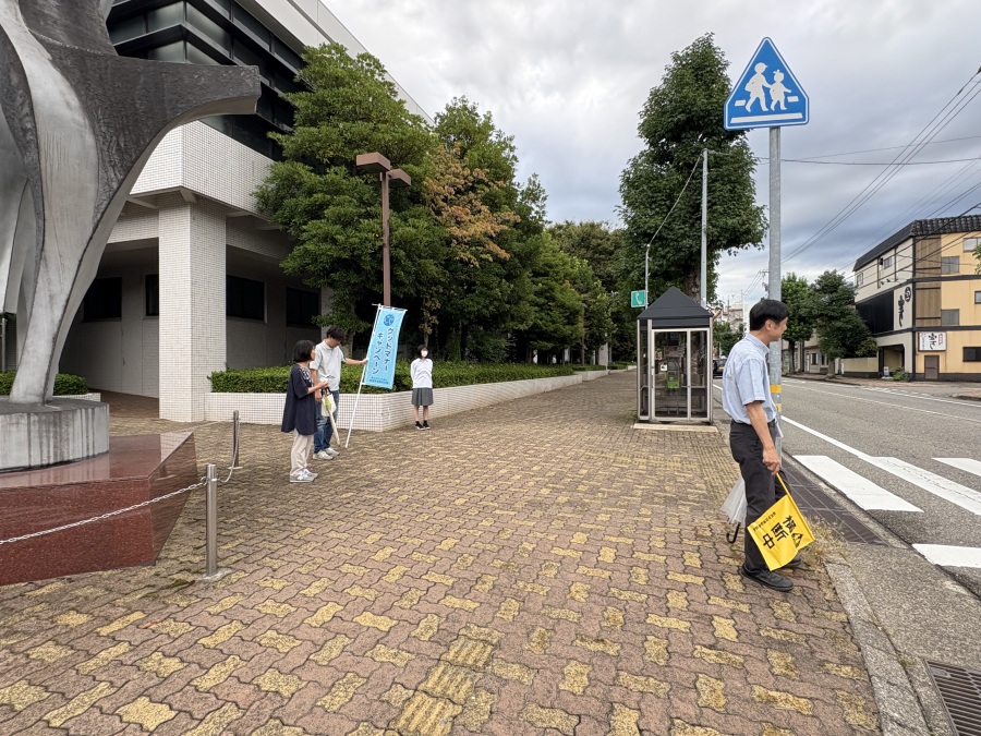 まずはアーチ下に集合し、ミーティングを実施。冒頭に山内先生(生徒主任)からご挨拶の言葉をいただいた後、各自の持ち場を確認し、5カ所(グラウンド横、マイクロ駐車場通りグラウンド沿い交差点、金沢市総合体育館近くの横断歩道、北陸銀行裏十字路、金沢南郵便局横付近T字路)に分かれて指導を行いました。