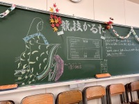 黒板に、紫式部と清少納言がアート風に描かれ、「競技かるた」のルールについても丁寧に示されていて、来場者も「競技かるた」に挑戦していました。